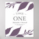 This rustic wedding decor features a table number sign framed by a beautiful border of autumn leaves in rich plum purple over a crisp white background. The modern sans serif and script typography add a stylish touch, making it perfect for fall weddings in September, October, or November. Ideal for a garden or outdoor theme, this design brings a cozy autumn feel to your celebration.