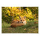 A cute young fox calmly peers from its grassy resting place with a background of autumn colour.