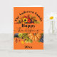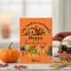 This customisable Thanksgiving card features a vibrant orange background highlighting two rich harvest scenes. The top border showcases sunflowers and fall foliage framing your family name. The bottom features an orange pumpkin, purple grapes, and green apples. The phrase "Happy Thanksgiving" is elegantly scripted across the middle, making this a bold, beautiful autumn greeting.