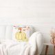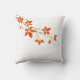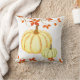 This throw pillow is shown in a autumn fall leaves and pumpkins print with a white background colour.