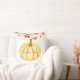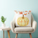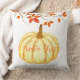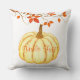 This throw pillow is shown in a autumn fall leaves and pumpkin print with a white background colour.