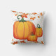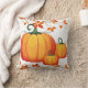 This throw pillow is shown in a autumn fall leaves and pumpkins print with a white background colour.