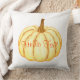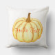 This throw pillow is shown in a autumn pumpkin print with a white background colour.
