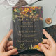 Beautiful rusty burnt orange and dark burgundy autumn fall flowers and pumpkin borders with strings of golden twinkle lights over a dark brown barn wood background making a charming elegant Fall in Love wedding invitation with a trendy handwriting gold typography script. +++++++++ Easy to personalise with your details! Suitable for traditional autumn fall rustic country farmhouse outdoor backyard weddings.
