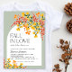 A perfect baby shower invitation for an autumn event. The design showcases a large grouping of beautiful fall coloured flowers and is accented with a white boho arched box and a light sage green background.