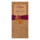 This affordable rustic autumn wedding menu coordinates with the wedding collection shown below and can be used at each place setting to carry your "Fall in Love" theme throughout your wedding. The simulated burlap texture background, Kraft paper look text area trimmed in wine and orange with a burgundy wine ribbon image running across the middle of the menu card has a cluster of autumn leaves and a small simulated wood heart in gold with burgundy lettering that says, "Fall in Love" on it. There is a removable arrow divider in burnt orange with the names of the bride and groom and the wedding date in burgundy wine and orange print. The menus details are printed on the back side in burnt orange. If you need additional matching items, please email your request to niteowlstudio@gmail.com or use the Zazzle chat feature to get in touch.