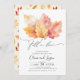 This engagement party invitation features beautiful autumn leaves, making it perfect for a fall-themed party. The invitation is simple and elegant, with a white background and black text. The autumn leaves adds a touch of whimsy and fun, and the overall design is perfect for celebrating the couple's upcoming wedding.