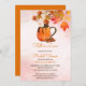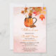 Fall in love autumn themed bridal shower template invitation instant download, watercolor pumpkin cup cinnamon spices cup hot chocolate maple leaves, brown background for autumn fall themed bridal shower.