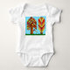 This baby bodysuit has an art deco design of trees coloured for fall made of various shapes on a field of blue.