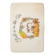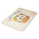 A bath mat with a typography design which says Fall is in the air. Illustrated with an adorable squirrel standing behind some orange watercolor pumpkins. A decorated foliage wreath surrounds them with an oak leaf, an acorn, autumn orange flowers and other sprigs and leaves. Background is a vintage looking off-white with aged light brown edges.