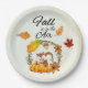 Typography design which says Fall is in the air. Illustrated with an adorable squirrel standing behind some orange watercolor pumpkins. A decorated foliage wreath surrounds them with an oak leaf, an acorn, autumn orange flowers and other sprigs and leaves. Background is a faux vintage parchment in a cream colour, with a rough aged look.