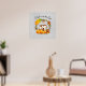A poster with a typography design which says Fall is in the air. Illustrated with an adorable squirrel standing behind some orange watercolor pumpkins. A decorated foliage wreath surrounds them with an oak leaf, an acorn, autumn orange flowers and other sprigs and leaves. The background is an image of rough grey texture.