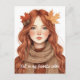 This card features a young woman personifying autumn, with vibrant red hair adorned with fall leaves, wrapped in a cosy scarf and sweater. It captures the warm, comforting essence of the season, perfect for those who love the cosy, autumnal vibe. Ideal for any autumn lover, especially those who enjoy embracing the "autumn aesthetic" or "fall vibes," this card is great for sending seasonal greetings, thank you notes, or just a thoughtful message to a fellow "autumn enthusiast.