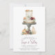 This sweet and charming invitation for fall or autumn season engagement parties features a watercolor illustration of an elaborate tiered cake decorated with pumpkins, greenery, and burgundy flowers, with your party details beneath in soft grey and burgundy lettering.