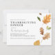Modern thanksgiving dinner invitations with an off-centre design and watercolor illustrations of fall leaves. Text is fully editable; heading text can be changed from "THANKSGIVING DINNER" to "FRIENDSGIVING DINNER", etc. The reverse side features a coordinating autumn pattern.