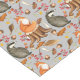 Autumn woodlands themed table runner pattern features fox and badger with leaves and acorns on light grey background.