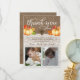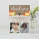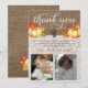 a thank you card for a baptism, Christening, Dedication etc with space for two photos. Great for twins or siblings (or just 2 photos of your baby!). The design features a burlap and lace look background with pumpkins and fall leaves.