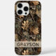 Customize this fall leaves camouflage iPhone 16 pro max case with your name in a trendy modern CAP font in brown on opaque cream. It's masculine and perfect for your favorite military, hunting, country or outdoorsman!