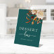 Fall Leaves Dessert Bar Pedestal Sign. Highlight your dessert table with this charming pedestal sign that matches your fall wedding aesthetic. With a teal backdrop and intricate watercolor artwork featuring terracotta and burnt orange leaves, copper roses, and cream florals, this sign adds a festive and cohesive touch to your sweets display. It’s the perfect way to guide guests while enhancing the overall appearance of your setup. Add your own message and make your dessert bar as memorable as the treats.