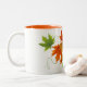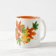 Ceramic coffee mug shown with a pretty autumn fall leaves print.Mug is shown in white with a orange interior.