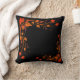 This throw pillow is shown in a autumn fall leaves print with a black background colour.