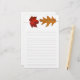 Lined writing paper with fall leaves header. An oak leaf and red maple leaf make a seasonal border at the top of white note paper, with no text. Use to write a thank you note or say hello.