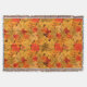 Layers of brown, orange, red, and gold maple leaves on a chocolate brown background.