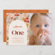 This cute girl's 1st/first birthday photo invitation features a tan/beige background with mushrooms, wildflowers, and fall/autumn leaves. The reverse side features an orange background with floral patterns. Personalise for your needs. You can find more matching products at my store.