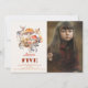 This cute kid's birthday photo invitation features a cream background with mushrooms, and woodland animals such as a deer, squirrel, hedgehog, racoon, and fox in watercolor. The reverse side features an orange background with floral patterns. Personalise for your needs. You can find more matching products at my store.