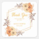 A classy and elegant birthday thank you sticker featuring an orange flower and brown leaves arrangement with modern gold typography on a white background.