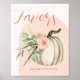 Add a warm, seasonal touch to your celebration with this Falling in Love with Baby party favours table sign. Designed with a soft blush pink arch over a creamy white background, it features a white watercolor pumpkin surrounded by eucalyptus greenery, blush roses, pampas grass, and pheasant feathers. The rich terracotta orange lettering reads Favours, with customisable text underneath for your special message or display instructions. Perfect for a girl’s fall baby shower, this sign coordinates beautifully with the entire Falling in Love with Baby collection for a cohesive, rustic-chic event look.
