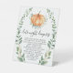 This baby shower late night diapers pedestal sign features a watercolor pumpkin and fall greenery gold foliage wreath.