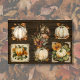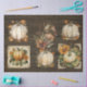 Beautiful vintage style artwork includes muted burnt light orange autumn pumpkin and white pumpkins with fall leaves and flowers over a rich dark rustic wood with elegant script handwriting ephemera and printer's ornaments perfect for crafting and furniture decoupage Artwork graphically designed by internationally licensed artist and designer, Audrey Jeanne Roberts, copyright.