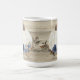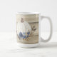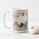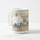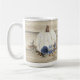 "Fall Pumpkin Navy Blue Floral Script Ephemera Rustic Wood coffee mug." This is a horizontal design layout of a white pumpkin with dusty slate blue and navy flowers and earthy coloured fall foliage over a light coloured rustic painted weathered reclaimed wooden barn board background that also has script handwriting ephemera and was painted in watercolor by internationally licensed artist and designer, Audrey Jeanne Roberts, copyright.