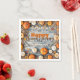 This customisable Thanksgiving paper napkin features a warm autumnal design. The background is a rustic grey wood plank motif, framed by plump orange and white pumpkins, colourful fall leaves, and twisting branches.