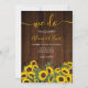 An elegant rustic brown wood with orange and green sunflowers bouquet illustration and script photo initials wedding , add 4 of your favourite couple photo , a country barn, minimalist and chic wedding invitation, add your initials at the back. Perfect for fall autumn weddings.