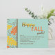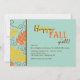 A bright and happy fall invitation in teal with gold and orange leaves and abstract swirls. Well-suited for any fall celebration. (Vecteezy.com - Fall and Autumn Card Vector Templates by happymeluv). The card is easy to customise with your wording, font, font colour, paper shape options and choice of six paper types.