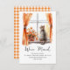 Introducing a beautifully crafted fall moving announcement card designed to capture the essence of new beginnings and the enchanting spirit of autumn. This delightful card features a charming watercolor illustration of a cute tabby cat perched on a windowsill, surrounded by a vibrant bouquet of orange seasonal flowers and lively orange curtains. Together, these elements create a whimsical and warm portrayal of the fall season.