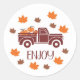 This gift sticker says "Enjoy" in maroon with a truck full of pumpkins. It is a great addition to the baked goods or treats you make for your friends and family.