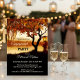 Elegant engagement party invitation featuring a colourful autumn tree and festive lantern overlooking a romantic lake. The back side shows a gold and burgundy gradient striped design.