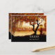An elegant Save the Date postcard featuring a colourful autumn tree and festive lantern overlooking a romantic lake. The back side shows the same fall scene with two images of optional text background fields. If you do not need that, you can delete them. (for instance if you are using address stickers).