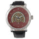 A turkey masks an elegant, Thanksgiving themed mandala, featuring Native American patterns and modern icons, like cornucopias, apples, and leaves, in shades of red, yellow, and orange for fall. This watch is available in a variety of colours, styles, and sizes, including sizes for both kids and adults.