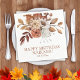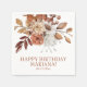 Fall watercolor floral on white birthday party paper napkins in autumn colours orange, rust and gold.
