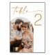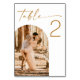 Guide your guests with style using this personalised double sided wedding table number card. Featuring bold typography in a rich mustard brown and a modern arch photo frame, this design allows you to showcase two different photos - one on each side - for a meaningful and personal touch. Perfect for weddings, receptions, rehearsal dinners, and anniversary celebrations, these table numbers combine functionality with keepsake value, letting your guests admire your favourite photos while easily finding their seats. The warm mustard brown colour palette makes it especially suited for autumn weddings, rustic chic themes, and fall earthy elegant events.
