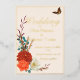 Elegant Gold foil invitation lettering on elegant ivory background is complemented by colourful autumn dahlias, roses, anemone, wheat stalks and monarch butterflies to make a striking but simple wedding invitation. The Monarch butterfly emphasizes the gold foil text on the front and the couple photo on the back for a truly autumnal wedding theme.