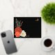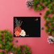 Elegant Gold foil invitation lettering on elegant black background is complemented by colourful autumn dahlias, roses, anemone, wheat stalks and monarch butterflies to make a striking but simple wedding invitation postcard. The Monarch butterfly emphasizes the gold foil text on the front and the couple photo on the back for a truly autumnal wedding theme. A QR code template lets you save postage and the planet with one mailing.