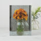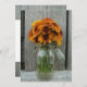 A fall wedding invitation featuring a photo of a jar of orange and yellow flowers in front of a background of barnwood. Look for matching items at Jill's Paperie.