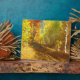 An overgrown path meandering through the birch forest on a sunny autumn day. The black and white trunks of the trees contrast with leaves and grass in all shades of gold, from pale yellow to deep orange, lit by the sun rays streaming through the branches.