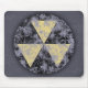 Grungy fallout shelter symbol, black/yellow over purple, heavily distressed. On t-shirts, sweatshirts, buttons, gifts.