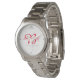 Silver tone women's bracelet watch features a petite Silver-Grey coloured crown at 12:00, a White face with Silver-Grey time markings and your three personalised monograms shown in fancy script in Red. Has a preformatted line beneath the monograms reading "Families Are Forever" with a date beneath waiting for your personalisation. Customise this watch further and choose a different style, colours etc.